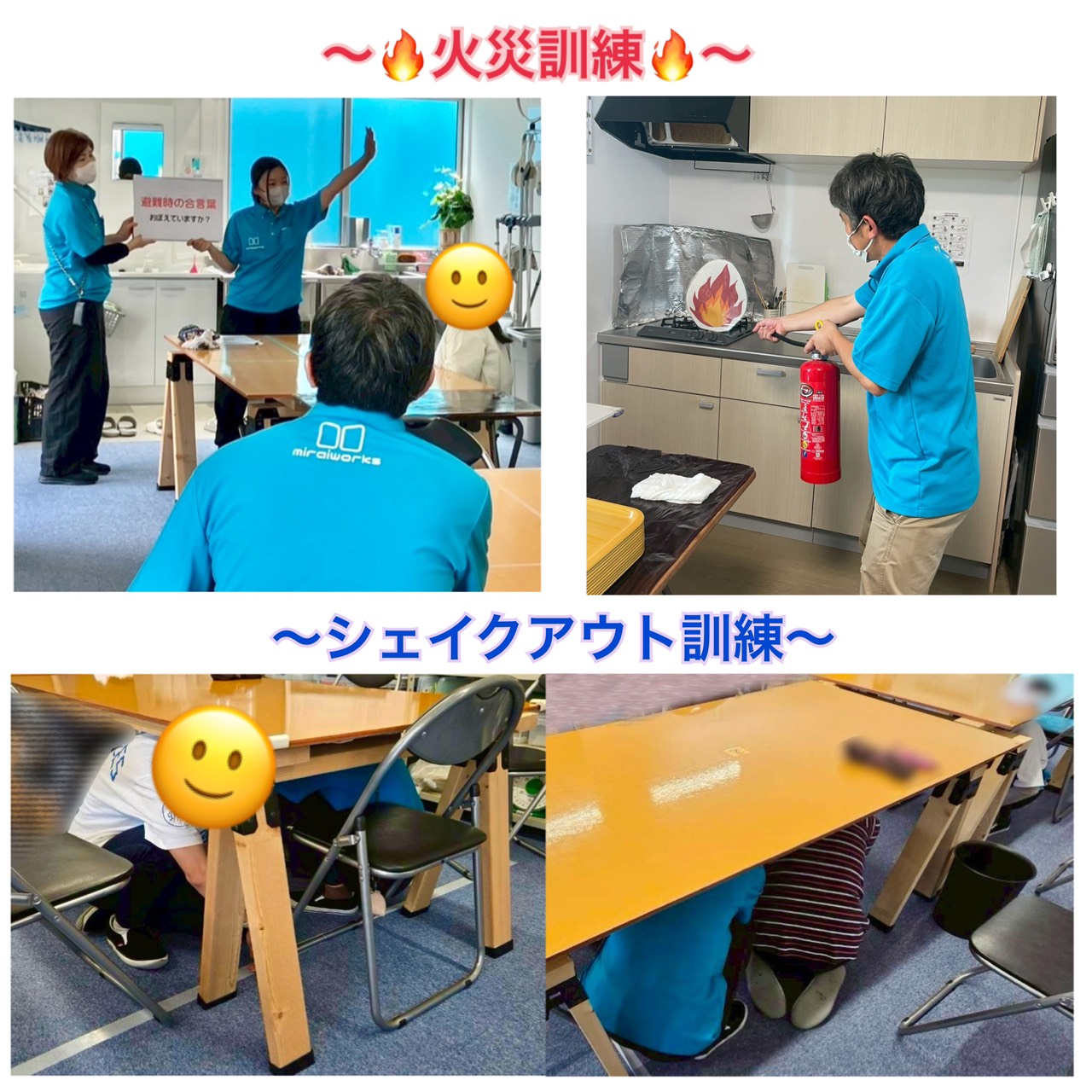 火災訓練では「火事だーー!」の合図で口元を覆い